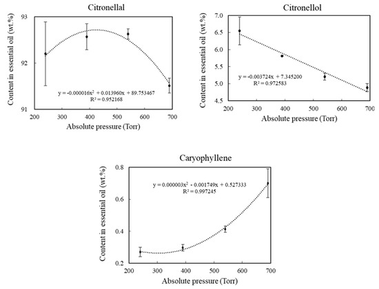The relationships between the content and the absolute pressures for the compounds citronellal, citronellol, and (E)-caryophyllene are presented in Figure 3.