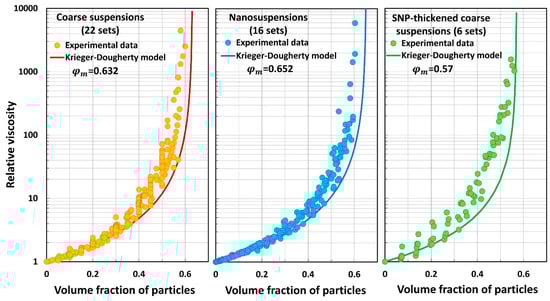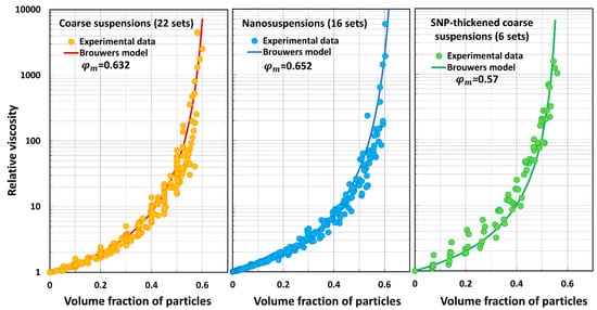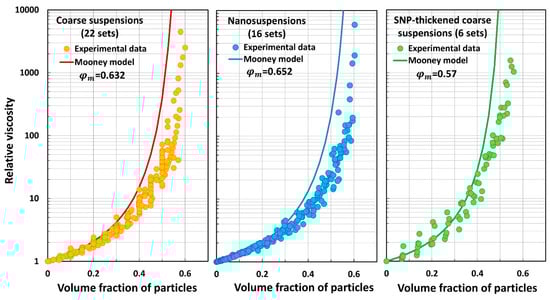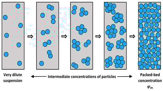The publication of the Einstein equation triggered a lot of long-lasting activity on the rheology of dilute and concentrated suspensions [19,20,21,22,23,24,25,26,27,28,29,30,31,32,33,34,35,36,37,38,39,40,41,42,43,44,45,46,47,48,49,50,51,52,53,54,55,56,57,58,59,60,61,62,63,64,65,66,67,68,69,70,71,72]. In this section, two well-known models for the viscosity of concentrated suspensions are discussed, namely, the Mooney model [24] and the Krieger–Dougherty model [34]. These models are applicable over the full range of particle concentrations, ranging from zero to packed-bed concentrations.