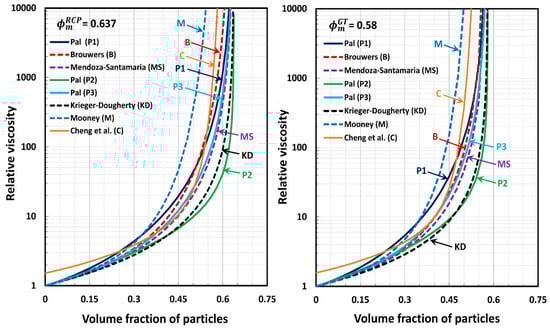 Comparisons of model predictions for two different values of maximum packing concentrations: and . M refers to Mooney model (Equation (13)), C refers to Cheng et al. model (Equation (16)), B refers to Brouwers model (Equation (26)), P1 refers to Pal model P1 (Equation (35)), P2 refers to Pal model P2 (Equation (41)), P3 refers to Pal model P3 (Equation (46)), MS refers to Mendoza and Santamaria-Holek model (Equation (23)), and KD refers to Krieger–Dougherty model (Equation (15)).