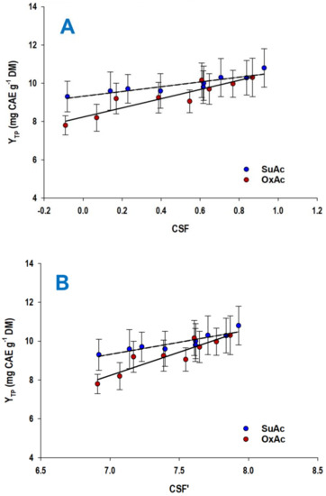 Linear regression between CSF (A) and CSF′ (B) with YTP. Bars indicate standard deviation. Assignments: SuAc, sulfuric-acid-catalyzed treatment; OxAc, oxalic-acid-catalyzed treatment.