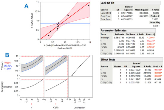 The models were represented by equations composed of significant terms only (Figure 3 and Figure 4, inset table “Parameter estimates”), while non-significant terms were excluded. The square correlation coefficients of the models, as well as the accompanying statistical information for each individual term, may be seen in Figure 3A and Figure 4A and in the inset tables provided. The final form of the models was as follows: