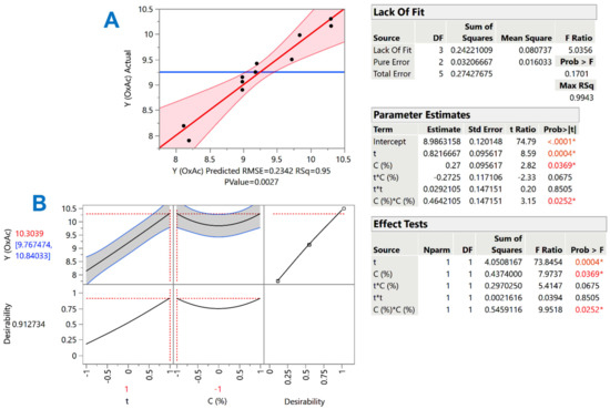 The sulfuric-acid-catalyzed treatment was significantly affected by both t (X1) and C (X2) but also their cross term (X1X2) (Figure 3, inset table “Parameter Estimates”). To the contrary, quadratic effects of either variable were non-significant. In the case of oxalic-acid-catalyzed treatment, once again, both X1 and X2 were shown to exert a significant influence on YTP (Figure 4, inset table “Parameter Estimates”), but a quadratic effect of X2 (X22) was also significant.