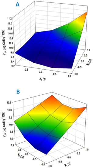 Three-dimensional diagrams presenting the effect of variation in both acid concentration (C) and treatment time (t) on the total polyphenol yield: (A) sulfuric-acid-catalyzed treatment; (B) oxalic-acid-catalyzed treatment.