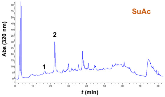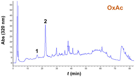Chromatograms of CSS extracts, obtained with sulfuric-acid-catalyzed (SuAc) and oxalic-acid-catalyzed (OxAc) ethanol organosolv treatments, under optimized conditions. The HPLC traces were recorded at 320 nm. Peak assignment: 1, neochlorogenic acid; 2, chlorogenic acid.