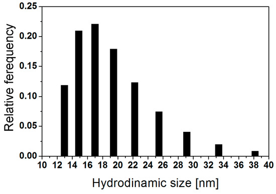 Figure 1 shows the hydrodynamic size distribution of the nanoparticles dispersed in the ferrofluid. This size varies from 13 nm to 38 nm, with an average hydrodynamic diameter of 17 nm.