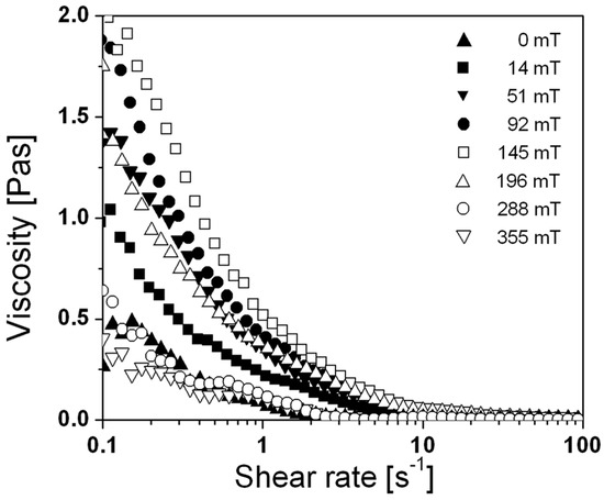 Figure 2 shows the viscosity (η) curves of the ferrofluid measured at different magnetic fields (B). The ferrofluid exhibits a shear-thinning behaviour at all magnetic fields, as the viscosity of the ferrofluid decreases with the increasing shear rate [27,33]. As the increases, the difference in the viscosity between the different magnetic fields becomes smaller. At shear rates higher than = 10 s−1, the differences become negligible. Figure 3 shows the viscosities at a constant shear rate = 0.5 s−1 measured at different magnetic fields (B). At first, the viscosity of the ferrofluid increases with the increasing magnetic field. The viscosity increases from η = 0.15 Pas, without the applied magnetic field, to η = 0.95 Pas at B = 145 mT. The increase of the viscosity with the increasing B is expected and was observed by others [5,7,8,11,27]. At higher fields, the viscosity of the ferrofluid decreases, and at B = 280 mT, it reduces to the initial value. With a further increase of the magnetic field, the viscosity of the ferrofluid reduces below the initial value.