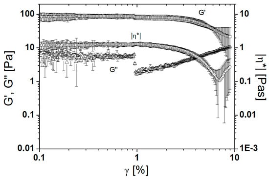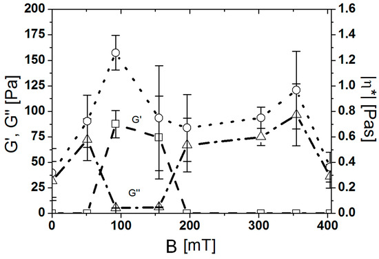 A similar trend is observed when performing an oscillatory test. A series of amplitude sweeps at the frequency ω = 100 s−1 were conducted for different magnetic fields B. Figure 4 shows an average of five measurements of amplitude sweep at B = 90 mT. When the ferrofluid was exposed to a magnetic field of B = 90 mT, a linear viscoelastic (LVE) range was observed, which ends at γ ~ 1%. In the LVE range, the storage modulus (G′) is higher than the loss modulus (G″), proving that at B = 90 mT, the ferrofluid exhibits a gel-like character since the elastic behaviour dominates over the viscous behaviour. A comparison between the average values of G′ and G″ at γ = 0.7% (Figure 5) extracted from amplitude sweep measurements at different magnetic field strengths was used to show the changes in the character of the ferrofluid. Up to 50 mT, only G″ is observed, and the ferrofluid exhibits a liquid character. At a magnetic field B = 50 mT, the G′ becomes higher than G″ as the ferrofluid becomes gel-like. The ferrofluid retained its gel-like character up to B = 200 mT, where the character of the ferrofluid reverted to that of a liquid. At B = 400 mT, the G″ reduces to the initial value. The complex viscosity η* of the ferrofluid also varies with the applied magnetic field. The absolute value of the complex viscosity increases from η* = 0.3 Pas at B = 0 mT to η* = 1.3 Pas at B = 90 mT. With any further increase in the magnetic field, the absolute value of the complex viscosity decreases to a plateau value of approximately 0.8 Pas. The plateau stretches from B = 150 mT to B = 350 mT. At B = 400 mT, the absolute value of complex viscosity reduces to the initial value. The LVE range is shorter compared to, and the magnetic field at which the gel-like character is observed is lower compared to the ferrofluid with particles coated with oleic acid and dispersed in kerosene [26].