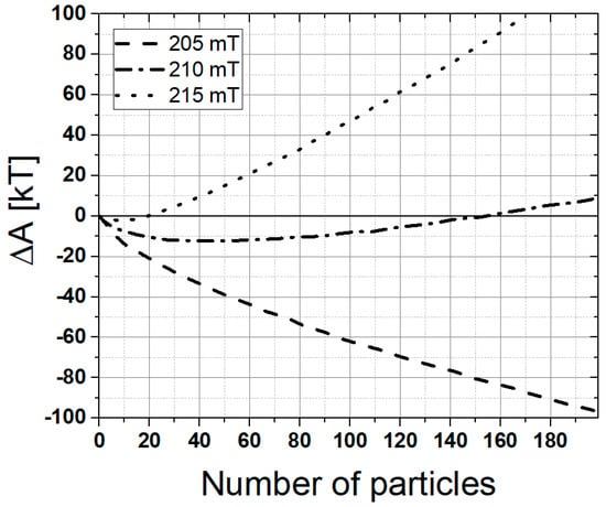 The decrease of the viscosity and the change of the rheological character from a gel-like substance to a liquid at higher magnetic fields can be explained by the transformation of the chain-like agglomerates into globular agglomerates. Figure 6 shows the total free energy of the agglomerates as a function of the number of nanoparticles in the agglomerate for different magnetic fields calculated using Equations (10) and (11). When the total free energy has a negative value, the chain-like agglomerates are energetically more favourable than the globular agglomerates. As can be seen from Figure 6, the theoretical magnetic field at which the transition from chain-like agglomerates into globular agglomerates occurred is at approximately B = 210 mT. Because the globules affect the flow to a lesser degree, the viscosity of the ferrofluid decreases.