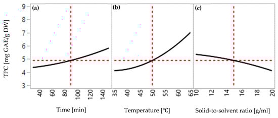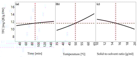 According to Table 3 and Table 4, it was seen that independent variables were statistically significant in the response. Furthermore, it is remarkable that extraction time was highly significant on the yield of TPC (p-value = 0.0004), while it had a less significant effect on the yield of TFC (p-value = 0.038). Extraction temperature showed a strong effect on the yield of TPC (p-value < 0.0001) and TFC (p-value < 0.0001). Meanwhile, the solid-to-solvent ratio was dominantly significant for both yields of TPC (p-value = 0.003) and TFC (p-value < 0.0001). More importantly, coefficient estimates generated from the regression analysis provided information about the magnitude and direction of the linear effect. Based on the data from Analysis of Variance (ANOVA), positive coefficients of extraction time (0.6 for TPC and 0.57 for TFC) and extraction temperature have positive coefficients (1.59 for TPC and 2.24 for TFC) which indicated a positive linear relationship, resulting in an increase in extraction efficiency with increasing levels of extraction parameters. On the other hand, the solid-to-solvent ratio provided a negative linear relationship due to the negative coefficient (−0.47 for TPC and −1.33 for TFC), thereby resulting in decreasing the extraction yield with rising levels of the solid-to-solvent ratio.