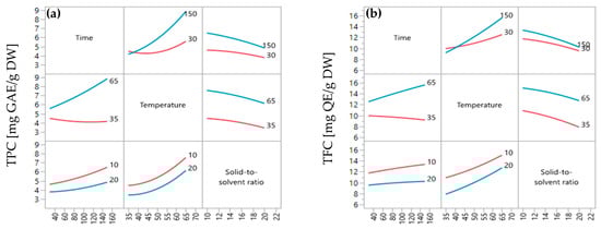 Interaction effect of extraction conditions on extraction yield: (a) total phenolic contents (TPC) and (b) total flavonoid contents (TFC).