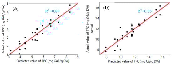 Figure 6 present the comparison between the predicted and actual values of TPC and TFC. The analysis showed a high correlation between the experimental data and the model’s predicted values, as indicated by the coefficient of multiple determination (R2) of 0.89 for TPC yield and 0.85 for TFC yield. Furthermore, the model was found to be statistically significant with a p-value smaller than 0.0001.