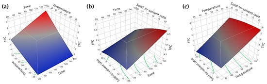 Surface plot for the yield of TPC (mg GAE/g DW): (a) time (min) and temperature (°C); (b) time (min) and solid-to-solvent ratio (g/mL); (c) temperature (°C) and solid-to-solvent ratio (g/mL).