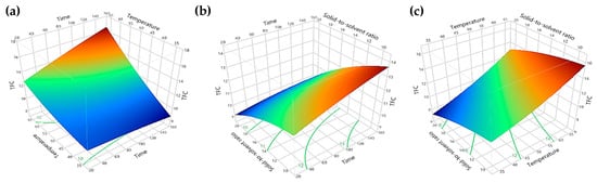 Surface plot for the yield of TFC: (a) time (min) with temperature (°C); (b) time (min) with solid-to-solvent ratio (g/mL); (c) temperature (°C) with solid-to-solvent ratio (g/mL).