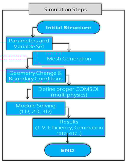 Presented below in Figure 1 is a flow chart showcasing the major simulation stages, which are as follows: the creation of cell design schematics and the setting of parameters, mesh generation, the numerical simulation analysis of the carrier transport, and the optical generation of a distribution map of the CIGS thin-film solar cells (made using COMSOL multiphysics software, version 5.5.0.359). The optical generation rate across the cell structure, electric field profile, recombination rate, and their impact on device performance were also simulated for this paper. To the best of our knowledge, for the first time, a 3D analysis that involved solving the corresponding equations related to optical–electrical coupling profiles for CIGS solar cells was introduced. Moreover, various cell structures with different absorption layer thicknesses and GGI ratios were investigated and compared. The optimum parameters were calculated, and their effect on the CIGS cell performance was discussed.