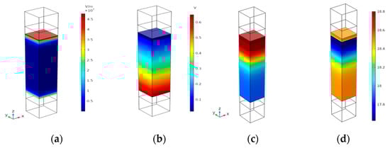 - Electrical-coupled Poisson and current continuity equations added through a semiconductor module []:where ϵr is the relative permittivity, ϵ0 is the vacuum permittivity, is the charge density, and is the electric potential.