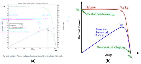 (a) Simulated current–voltage and power–voltage characteristics of the simulated CIGS cell; (b) typical I-V and P-V characteristics for a solar cell. The main output parameters are also indicated.