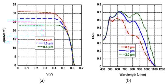 Simulated J-V characteristics (a) and external quantum efficiency (EQE) spectra (b) of the CIGS solar cells with thicknesses of 0.5, 1.0, and 2.0 µm and a GGI ratio of 0.6.