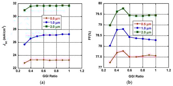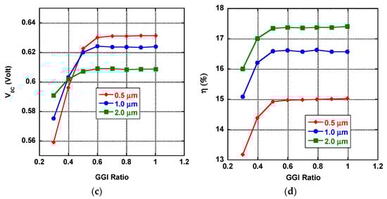 Simulated CIGS solar cell performance parameters—(a) Jsc, (b) FF (%), (c) Voc, and (d) ɳ (%)—versus GGI ratios for cells with different CIGS layer thicknesses.
