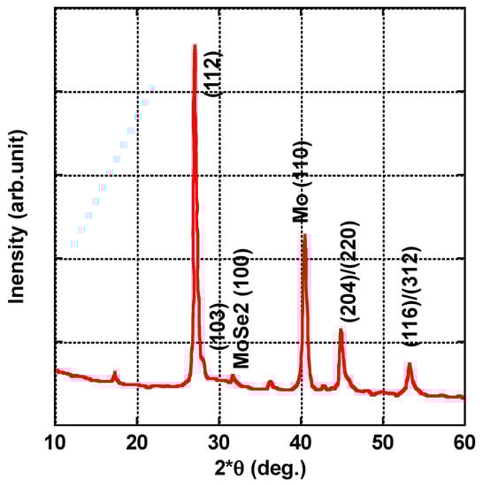 Figure 10 depicts the representative X-ray diffraction pattern of the CIGS thin film coated on the Mo substrate. Based on the simulation results, the GGI ratio of the CIGS absorption layer was 0.6, with a thickness of 2 μm. All of the CIGS films have chalcopyrite phases with the following major diffraction peaks: (112), (220)/(204), and (312)/(116). The sharp diffraction peak (112) at 2θ = 26.95° is the strongest. This shows that the CIGS films are polycrystalline and oriented along the (112) direction, which is parallel to the substrate. The major sharp peak can be observed, which corresponds to the diffraction of the (112) plane of the chalcopyrite structure CIGS (JCPDS NO.: 35-1102). The other diffraction angles located at 44.8° and 53.3° correspond to the (220)/(204) plane and the (312)/(116) plane, respectively. The intensities of these two peaks are relatively low compared to the (112) plane, indicating the preferential orientation of the (112) plane. However, these orientations enable the formation of higher-quality p-n junctions due to the higher diffusivity of the Cd atoms in the (220)/(204)-oriented layers. The grain size was calculated using the Debye–Scherrer equation based on the full width at half maximum (FWHM) obtained from the highest intensity peak (112), and it was found to be about 65 nm. The XRD patterns do not show any complex peaks, indicating that the single-stage annealing process may result in acceptable chalcopyrite structures in CIGS thin films. In addition, a sharp peak (110) and a small peak (100) were observed for the Mo layer and the MoSe2 phase, respectively. This indicates that there are no secondary or impurity phases with different lattice parameters in the CIGS films, and this was subsequently further confirmed by EDXRF measurements.