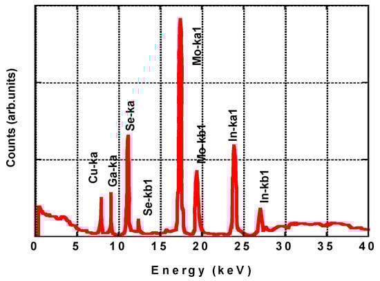 Moreover, detailed experiments have been performed on evaluating the thickness and elemental composition of TFSCs via EDXRF spectroscopy, which is a versatile, non-destructive, non-vacuum, and fairly simple technique []. Recently, CIGS solar cells were prepared using various deposition techniques, as reported by many researchers [,,,].