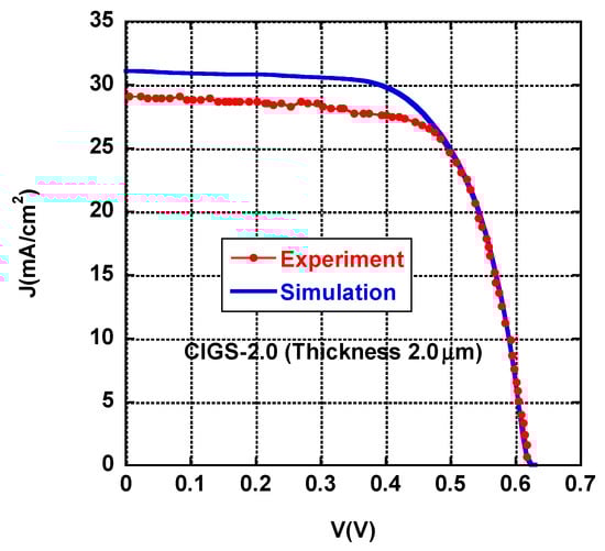 Figure 13 depicts a comparison of the experimental and simulated J-V curves for the prototype cell (CIGS-2.0) at room temperature and a sun simulator power (Pin of 1000 W/m2). Detailed experimental parameters for other cells with different thicknesses are not shown here since our study focused on prototype cells with optimum simulated parameters, specifically with a thickness of 2 µm. However, one can compare the simulated parameters for this prototype cell using the experimental results, and Table 4 summarizes these results for the CIGS-2.0 solar cell.