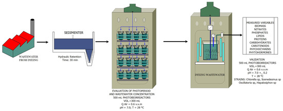 - Dhaouefi, Z.; Toledo-Cervantes, A.; García, D.; Bedoui, A.; Ghedira, K.; Chekir-Ghedira, L.; Muñoz, R. Assessing Textile Wastewater Treatment in an Anoxic-Aerobic Photobioreactor and the Potential of the Treated Water for Irrigation. Algal Res. 2018, 29, 170–178. [Google Scholar] [CrossRef]