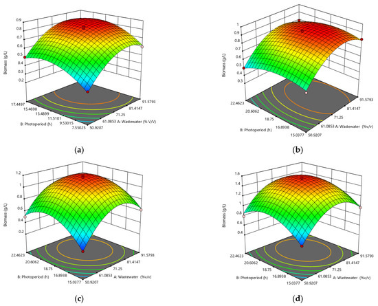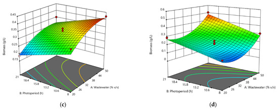 Optimization of wastewater concentration and photoperiod via response surface analysis for biomass production for (a) Chlorella sp., (b) Scenedesmus sp., (c) Oscillatoria sp., and (d) Hapalosiphon sp.