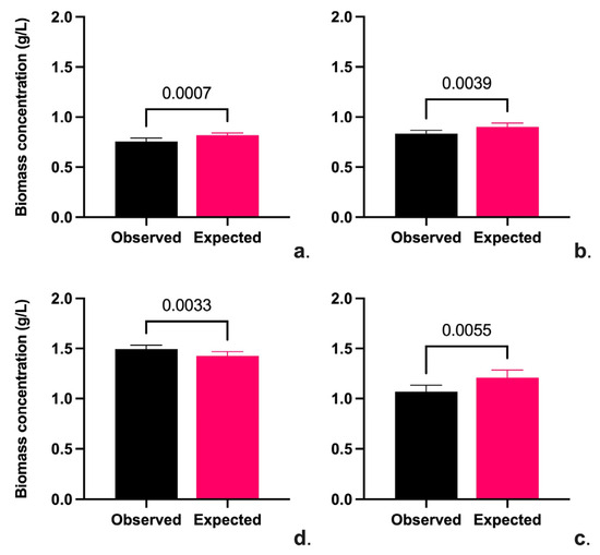 Validation of optimal conditions for biomass production on Chlorella sp. (a), Scenedesmus sp. (b), Hapalosiphon sp. (c), and Oscillatoria sp. (d).
