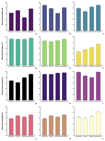 Biomass production is generally related to the dye degradation rate; the type and concentration of dye significantly affects biomass production. However, textile effluents have different types and concentrations of dyes that affect the biomass of microalgae and cyanobacteria [51]. Although there are few studies on real dye effluents, reports on the use of microalgae and cyanobacteria in textile effluents have shown that the concentration of dye in the system improves the removal rate due to the increased contact opportunities between the dye molecules and the microalgae and cyanobacteria cells during the biosorption process and is also a driving force for overcoming all the barriers for mass transfer of the dye molecules between the cells [28,50]. Degradation of dyes requires a source of nitrogen and phosphorus and, depending on the type of metabolism (autotrophy, mixotrophy, and heterotrophy), a source of organic carbon [40,52]. In this work, it was shown that nitrate concentration in wastewater affects the growth of Scenedesmus and Chlorella sp., while it has no effect in the case of cyanobacteria since they can fix nitrogen. Finally, it has been pointed out that the effluent concentration and light cycle affect the biomass production process of both microalgae and cyanobacteria [53]; this work has shown that the optimization of these parameters increased the biomass production in all the strains evaluated. Figure 5 shows the removal of contaminants from the conditions by each strain.