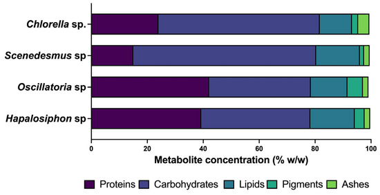 Figure 6 shows the percentage of metabolites produced by Scenedesmus, Chlorella, Oscillatoria, and Hapalosiphon sp. grown in industrial dyeing wastewater according to the biomass production optimization conditions obtained. Evidently, the highest production was obtained in the strains of cyanobacteria: 38.5% for Hapalosiphon sp. and 42.3% for Oscillatoria sp.; in carbohydrates, the microalgae strains obtained the highest production percentages: 65. 38% for Scenedesmus sp. and 57.68% for Chlorella sp. For lipids, the strain Hapalosiphon sp. showed the highest accumulation (25.88%), and finally, the cyanobacteria showed the highest pigment concentration. The variation in metabolite production rates between microalgae and cyanobacteria primarily arises from the distinct metabolic traits exhibited by these organisms [55]. Factors such as biomass density, molecular weight, the type of algal biomass, species variations, metabolic activity, growth stage, environmental circumstances, and the presence of nutrients in the wastewater can influence the levels and buildup of metabolites [56]. There are few studies on the cultivation of microalgae and cyanobacteria in real dyeing effluents, while most studies are on synthetic effluents using a single dye; however, there are some reports on the use of Chlorella sp. and Oscillatoria sp. strains for the treatment of dyeing effluents.