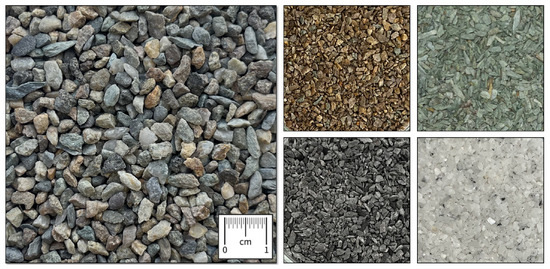 The sands of the study area were initially classified according to the size distribution for particles between the 3 (76.20 mm) sieve up to particles in the No. 200 (75 mm) sieve, and they were visually separated based on the color of the particles (gray, green, reddish, and white). This allowed the chemical characterization and determination of the electrokinetic potential (zeta) for each representative fraction. Therefore, the samples were selected from a group of particles that passed through sieve No. 4 (4.75 mm) and were retained in sieve No. 10 (2.0 mm) for visual analysis and identification of representative fractions, as presented in Figure 1. Furthermore, a group of particles from sieve No. 16 (1.19 mm) to sieve No. 500 (25 m) were selected for SEM-EDS analysis, and a group of particles that passed sieve No. 200 (75 m), No. 400 (37 m), and No. 500 (25 m) were selected for thermogravimetric, XRF, XRD, and electrokinetic potential (zeta) analysis.