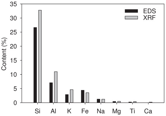 The X-ray fluorescence spectrometry is a common technique for the analysis of bulk specimens and for the identification of the major chemical elements in geological samples [33]. XRF analysis is one of the most used methods for mineral and rock analysis due to its ability to identify major elements, such as Na, Mg, Al, Si, P, Mn, and Fe, and trace elements, such as Zr, Zn, Ba, Pb, Ni, and Cu [34]. Moreover, XRF spectrometry is a powerful and highly used method due to its ability to determine chemical compositions of solid materials for geochemical analysis [35]. It is important to highlight that XRF uncertainties are commonly less than 0.2 to 0.4% for major elements. Furthermore, XRF allows analysis in parts per million (ppm) that cannot be measured using competitive techniques, such as EDS [34].