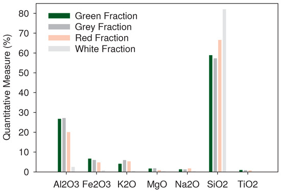 The identification of the present elements in the representative fractions was consistent with the results obtained via EDS, with some variations of up to 8% between both techniques, as presented in Figure 3. The values of the XRF analysis were higher than those obtained via EDS, an aspect attributed to the quantitative and non-superficial identification of the analysis technique, as it only happens with EDS. The estimation of the chemical compounds in their oxide form allowed the identification of silicon dioxide (SiO), or silica, as the major constituent for sands in proportions up to 85% for all the representative fractions, the identification of aluminum oxide (AlO) in up to 28%, and the presence of ferric oxide (FeO) and potassium oxide (KO) in up to 8% that could be related with the presence of muscovite (Ms), as presented in Figure 4. The sands under study showed a high presence of quartz structures, a mineral that exhibits good resistance to weathering processes [48], and are commonly insoluble in water. Furthermore, XRF analysis showed the presence of FeO in proportions up to 8% for the green and red representative fractions, considering that iron (III) oxide, in its hematite structure, could be attacked by acids with a predominantly low dissolution rate (over a high dissolution rate) based on the type of acid [49,50,51].