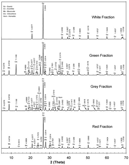 All representative fractions showed consistent patterns with quartz peaks, presented at 26.625, 50.109, and 20.649 for 2 values, as presented in Figure 5, and were also consistent with the chemical compounds identified in the XRF analysis. The XRD identification was consistent with two major phases: quartz (Qz) and muscovite (Ms). For the white representative fraction, a pure quartz phase was identified, while quartz (Qz) and muscovite (Ms) phases were identified for the other representative fractions, and some traces of minor phases of clinochlore (Cls) and anorthite (An) were identified for the green and gray fractions, as presented in Figure 5. Furthermore, the peaks are well resolved in the patterns, especially at d-spacing of 3.34 Å, 4.25 Å, and 1.81 Å.