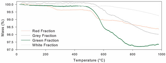 On the other hand, the TGA allowed a quantitative corroboration of the chemical elements and mineral structures presented in each of the representative fractions from the mass loss in specific temperature ranges. Therefore, Figure 6 shows the mass loss for the representative fractions in ranges up to 1000 °C, in which all representative fractions showed a loss of less than 3% in mass. All representative fractions showed a stable behavior, where the mass loss was less than 0.2% up to 200 °C due to the small quantities of sodium or magnesium oxides for the green, gray, and white representative fractions, in which the majority of the chemically bound water or absorbed water on the sand was removed [54,55]. Moreover, all representative fractions presented endothermic peaks near 50 °C that may be related to the to the dehydration of the minerals [56], with a small weight of 0.2%. However, the red representative fraction showed a mass loss (up to 0.7%) between 200 and 230 °C due to the significant presence of potassium oxide (KO) and sodium, as shown in Figure 6.
