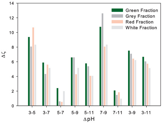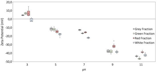 All the representative fractions under analysis showed a similar behavior, given the similarity in the mineralogical composition, as presented in Figure 7. All samples showed a stable behavior in the pH transition between 5 and 7, with an increase in zeta potential (more negative values) with the increasing pH. Furthermore, it is important to highlight the variation at pH 9 and pH 11, where the green representative fraction presented more negative ZP values due to the greater presence of aluminum, as presented in Figure 4. Moreover, the valence (+3) resulted in a more negative ZP with the increase in pH, consistent with Erzin et al. [68]. Another factor that could affect the ZP is the presence of magnesium (valence of +2). However, all the fractions of the sands under study presented contents below 1%, as shown in Figure 4, and with variations of up to 0.5% between them. Therefore, it is determined that, due to the low magnesium content, it does not affect the ZP values obtained.