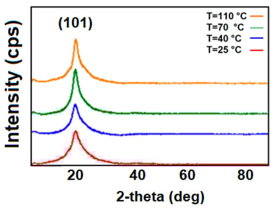 XRD results for PVA annealed for 1 h at temperatures of 25 °C, 40 °C, 70 °C, and 110 °C.