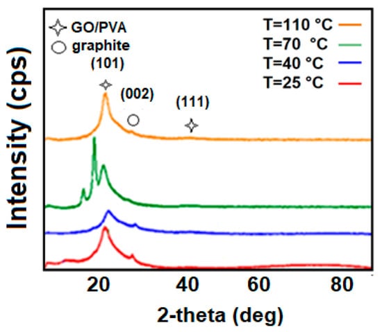 XRD results for 2% GO/PVA composite subjected to annealing at various temperatures. (T = 25 °C; T = 40 °C; T = 70 °C; T = 110 °C).