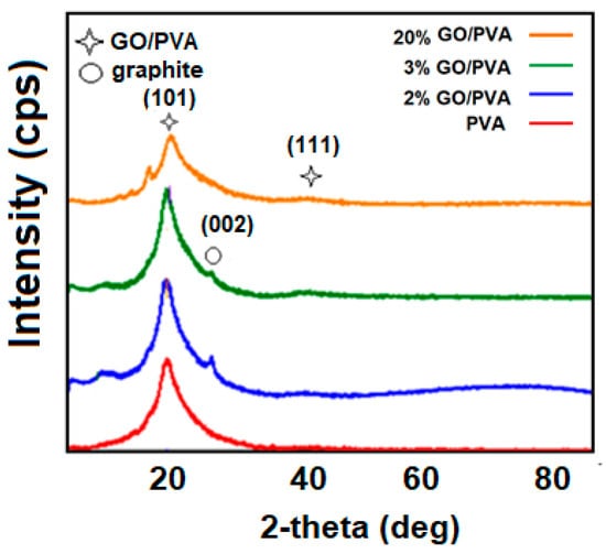 The characteristic peaks of the graphite are observed in the 2% concentrated GO/PVA and 3% concentrated GO/PVA. It is assumed that at low concentrations of GO, the chemical interactions between the particles are smaller because the distance between them is greater. In this regard, the XRD pattern of the composite indicated slight peaks related to the initially selected material (3% and 20% GO/PVA).