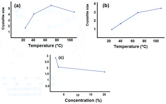 Williamson–Hall plots and the Debye–Sherer equation were utilized in the scientific literature to determine the crystallinity dimensions of GO/PVA composite materials [28,29,30,31,32]. The crystal sizes of the 2%, 3%, and 20% GO/PVA obtained at room temperature were compared in the present work, both from the obtained results at different temperatures for pure PVA and from thermally annealed samples at different temperatures and by determining their crystal sizes using the Debye–Sherer equation. Temperature and concentration-dependent graphs have been drawn (Figure 5). Figure 5a depicts the variation of PVA crystal sizes at different temperatures, Figure 5b shows the temperature dependence graph of the crystal size of the thermally annealed samples for the 2% GO/PVA sample, and Figure 5c illustrates the crystal size as concentration changes.