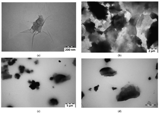 TEM images of 1% GO/PVA and 5% GO/PVA composite are shown in Figure 6c,d, respectively. The polymer present in these samples generated turbidity in the TEM study. The analysis of these two samples reveals that the polymer stopped the sample from delaminating. A TEM picture of the Figure 6d sample indicates that the graphene oxide is distributed as flake-like shapes over the grid. This is because PVA is used. Figure 6d shows the GO under the polymer layer. If you look closely, you can see the thin layers. The tear of the polymer on the left side of the sample shows more clearly that the underlying GO is in the form of a thin layer. However, at higher concentrations, the Van Der Waals forces between the particles bind the GO layers more tightly and lead to the formation of GO agglomerates. This fact is confirmed both in the XRD pattern and in the TEM (Figure 6a,b) images.