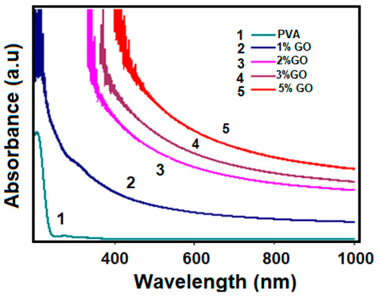 Absorbance for samples decreases with increasing wavelength, which suggests an indirect band gap. In an indirect band gap material, the absorption of light occurs through a process involving phonon interactions, which require the transfer of both energy and momentum. As the wavelength increases, the likelihood of phonon interactions decreases, resulting in a decrease in absorbance. As is commonly known, PVA is up to 90% translucent. The opacity of GO/PVA nanocomposites is controlled by varying the GO content. This is caused by the formation of intermolecular hydrogen bonds between OH and additional ions. Depending on the amount of GO in the GO/PVA composite, there are changes in the structure of the composite, as well as a difference in the optical properties [33]. Optical absorption increases with increasing GO concentration in nanocomposites, which can be explained by two factors [13]: