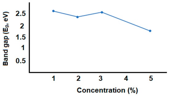 The influence of concentration on optical characteristics was investigated in scientific research by plotting the percentage of GO in the chitosan-GO composite material as a function of the Eg value [37]. Figure 9 depicts the concentration and band gap value dependence of GO/PVA nanocomposite material.