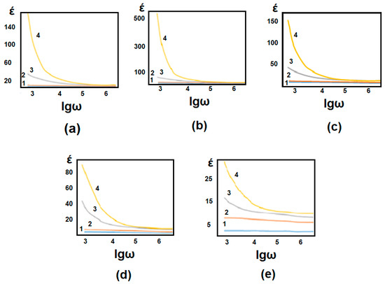 As can be seen from the graphs, the largest values of the dielectric constant correspond to the low frequencies of the electric field. It also has enough time for the dipoles to rotate in the direction of the electric field at small values of the frequency of the electric field, but with the increase of the frequency, the dipoles cannot follow the polarization [39,40]. As a result, the value of the dielectric constant is naturally lower.