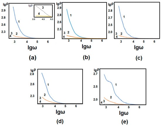 Dependence of the specific resistance of 1% (a), 2% (b), 3% (c), 5% (d), and 20% (e) concentrated GO/PVA composite on the logarithmic value of electric field frequency at different temperatures.