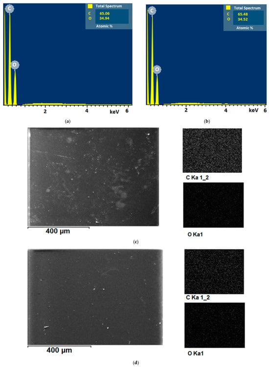 EDS spectra of (a) 1% GO/PVA; (b) 5% GO/PVA and element mapping of the (c) 1% GO/PVA; (d) 5% GO/PVA nanocomposites.