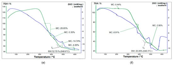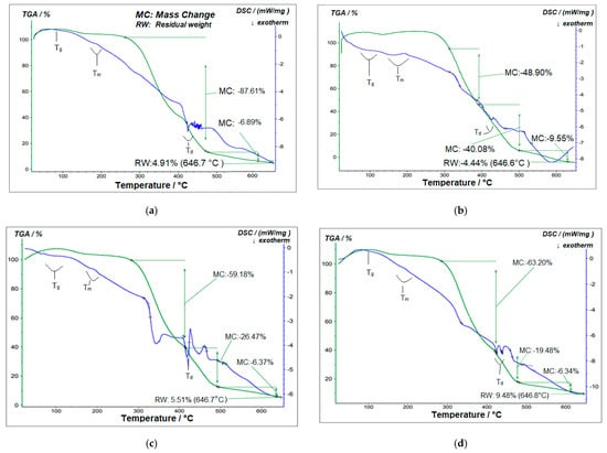 The thermal resistance of the produced polymer composite films was examined utilizing DSC and TGA. Representative DSC thermograms and TGA curves are demonstrated in Figure 13.