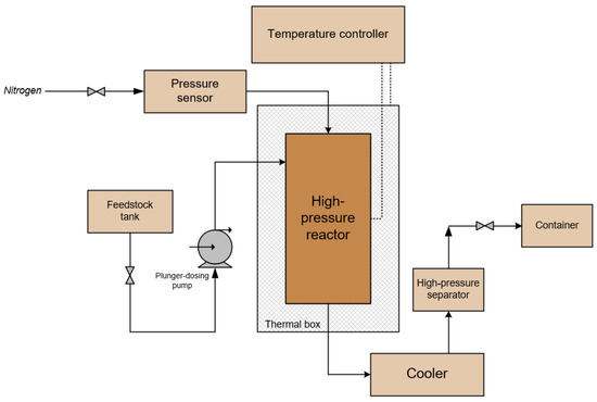 The feedstock is poured into the feedstock tank, from where it is fed to the suction line of the plunger-dosing pump. Feedstock, getting into the upper zone of the reactor, passes through a layer of catalyst. At the exit from the reactor, the product heated to a certain temperature is cooled, and the vapors formed are partially condensed in the condenser at 20 °C. The condenser is a shell-and-tube heat exchanger, in which cooling occurs due to the supply of distilled water at a given temperature into the shell side. The product, after passing through the heat exchanger, enters the high-pressure separator, where partial cooling also occurs due to the supply of water to the separator jacket. The gas phase from the separator is discharged from the system to the atmosphere through a pressure control valve. The liquid product is taken from the high-pressure separator into a specially prepared container for further analysis.