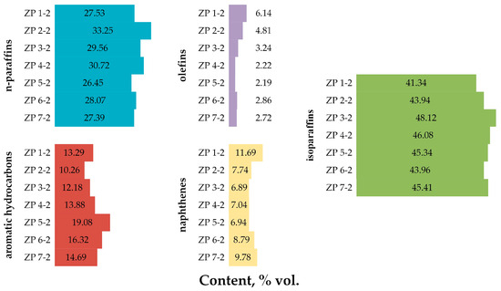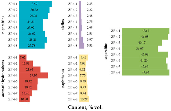 Also, from the data presented in Figure 3, it can be concluded that an increase in the feedstock space velocity from 2 h−1 to 4 h−1 leads to a decrease in the content of n-paraffins in the resulting products (by 4.94% vol.) and aromatic hydrocarbons (by 3.08% vol.), as well as an increase in the content of isoparaffins (by 1.55% vol.), naphthenes (by 3.23% vol.) and olefins (by 3.29% vol.). The predominant group in the composition of the obtained products is isoparaffins; the group of hydrocarbons with the lowest content is olefins.