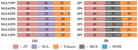 It can be concluded that the NGL samples are characterized by relatively low sulfur content. The processing of NGLs on a zeolite catalyst will make it possible to obtain blending components of motor gasolines that meet the requirements for motor gasolines of the highest environmental classes [32]. The resulting products will not require additional hydrotreatment; the minimum sulfur content will save the resource of catalysts at all stages of processing. The obtained density values of the NGL samples are close to the density values of such common blending components of gasoline as gas gasoline (650–660 kg/m3), alkylates (680–700 kg/m3) and isomerate (640–680 kg/m3). It should be noted that the NGL samples are characterized by a relatively high evaporation temperature, which makes it possible to use the products of their processing on a zeolite catalyst to increase the SVP of motor gasolines in winter periods. The fractional composition of the NGL samples is extremely close to the fractional composition of straight-run gasoline fractions. As can be seen, the NGL samples do not have high RON values. However, the knock resistance of this hydrocarbon feedstock is on average 10 points higher than the knock resistance of straight-run gasoline fractions.
